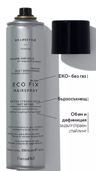 Лак за коса без газ, дълготрайно задържане и обем. Ефект копринен блясък. Без остатъци.